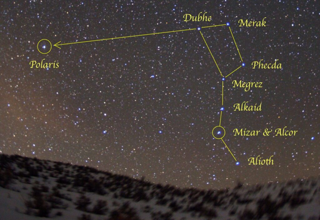 At times Polaris is covered by clouds, but there are other ways to find the North Star, or what is close enough to the North Star to navigate. The easiest way, if you can see them amidst the clouds, is to find the two stars on the scoop end of what we call the big dipper – Dubhe and Merak. A line drawn using these two stars as a guide points almost directly to the North Star, 30 degrees away.